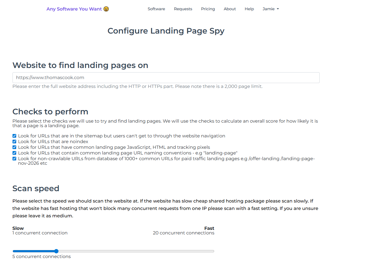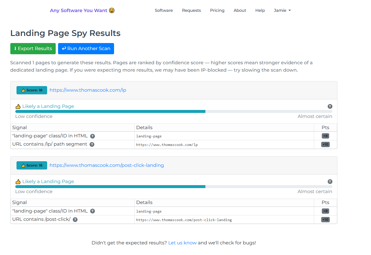 Enter any competitor's domain and choose your detection methods. Landing Page Spy will crawl up to 2,000 pages and analyse each one against over 100 signals across five detection categories. Every page that matches is scored and ranked β the higher the score, the more confident we are that it's a dedicated landing page rather than a regular site page.